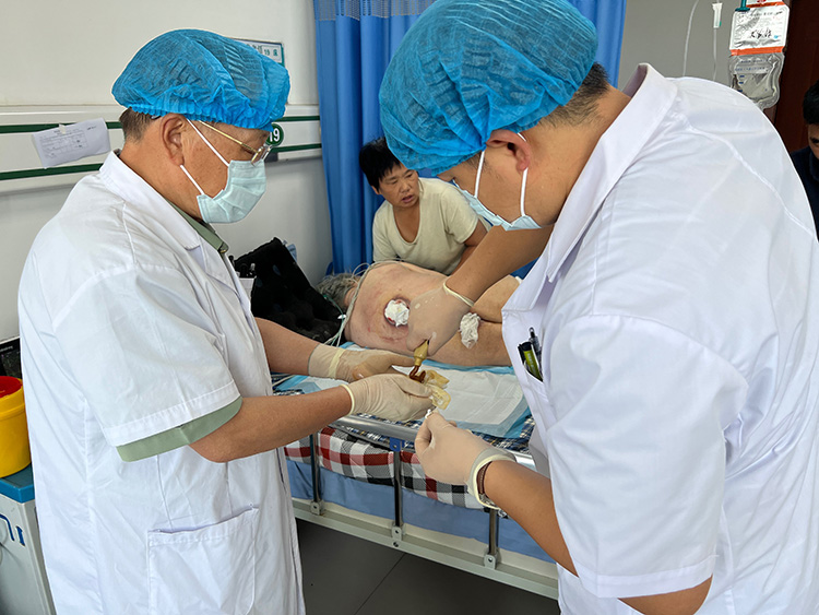2025年7月12日,中國中西醫(yī)結(jié)合學(xué)會燒傷專業(yè)委員會常務(wù)委員、《中國燒傷創(chuàng)瘍雜志》副總編輯王洪生,受邀到漳州市龍海區(qū)榜山衛(wèi)生院會診一例糖尿病足患者,王教授現(xiàn)場教學(xué),親自示范清創(chuàng)和換藥,得到了醫(yī)護(hù)人員和患者家屬的一致好評!