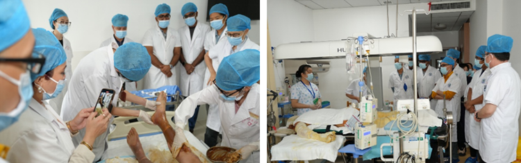 9月18日,代表團赴瀏陽市開展醫(yī)療交流,先后訪問了瀏陽市中醫(yī)院與瀏陽市人民醫(yī)院。兩家醫(yī)院在再生醫(yī)療技術(shù)臨床應(yīng)用方面均擁有深厚積累,尤其在大面積燒傷綜合救治領(lǐng)域成效顯著。當(dāng)日上午,代表團首先到訪瀏陽市中醫(yī)院,在燒傷科主任朱樹昌的陪同講解下,代表團實地了解到了翻身床、懸浮床、紅外線照射等設(shè)備在大面積燒傷治療中的輔助應(yīng)用,并就中西醫(yī)結(jié)合模式在提升創(chuàng)面修復(fù)效果與患者滿意度方面的實踐路徑,進行了深入交流。下午,代表團轉(zhuǎn)赴瀏陽市人民醫(yī)院。周明亮院長結(jié)合典型病例,系統(tǒng)介紹了該院將大面積燒傷創(chuàng)面的治療經(jīng)驗轉(zhuǎn)化應(yīng)用于慢性難愈合創(chuàng)面的臨床策略與關(guān)鍵技術(shù)。隨后,皮膚醫(yī)學(xué)中心主任蔣章佳與燒傷重建創(chuàng)面修復(fù)科主任焦獻功共同展示了獲專利認證的醫(yī)院自研設(shè)備——磨痂器及環(huán)鉆治療術(shù),借助臨床案例生動演示了該技術(shù)在處理大面積燒傷創(chuàng)面、慢性難愈合創(chuàng)面及瘢痕綜合管理中的顯著療效。訪問期間,代表團還與兩院醫(yī)護人員圍繞再生醫(yī)療技術(shù)的規(guī)范化實施、治療流程優(yōu)化及植皮手術(shù)操作要點等議題,開展了廣泛而專業(yè)的座談交流。