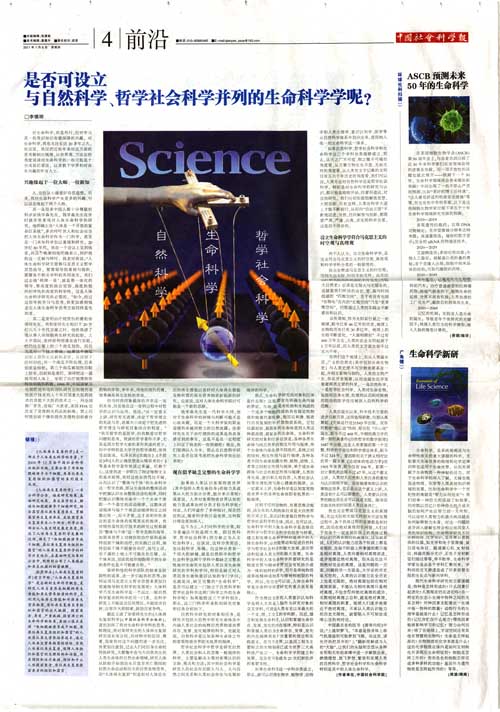 《中國社會科學報》:是否可設立與自然科學、哲學社會科學并列的生命科學學呢?