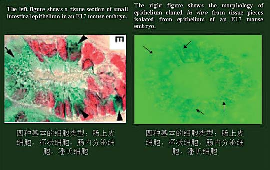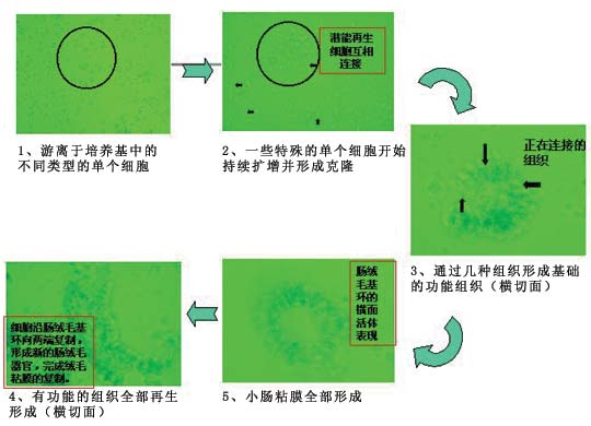 取17天胚胎鼠小腸的近段,分別切成小塊,貼附在培養(yǎng)器皿的底部,加MEM培養(yǎng)液和美寶生命物質(zhì),共同培養(yǎng),首先使絨毛組織細(xì)胞從原位小腸組織塊上游離到培養(yǎng)液中,而后將游離出的組織細(xì)胞單獨(dú)培養(yǎng),促使組織細(xì)胞增殖分化;繼續(xù)培養(yǎng),增殖分化的細(xì)胞則自行連接,重新形成原位的絨毛組織器官。實(shí)現(xiàn)了體外組織器官模型的建立。(詳見(jiàn)絨毛組織器官?gòu)?fù)制的全過(guò)程圖片介紹圖2.1~2.7)。