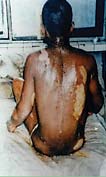 病例7:男,44歲,被熱堿燙傷面積達(dá)100% 治療前病人的背部 用MEBT/MEBO治療32天后燙傷創(chuàng)面再生痊愈