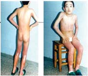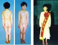 病例4:女,9歲,被開(kāi)水燙傷面積達(dá)93% 在治療過(guò)程中的背部情況 用MEBT/MEBO治療46天后燙傷創(chuàng)面再生痊愈,右上圖是病人一年后的現(xiàn)狀