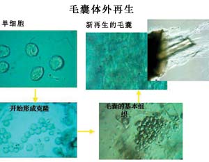 取小鼠的毛囊組織細(xì)胞,將單個(gè)細(xì)胞放入美寶毛囊培養(yǎng)液中培養(yǎng),單個(gè)毛囊細(xì)胞自身克隆復(fù)制、增殖、分化,而后連接,形成毛乳頭組織,再繼續(xù)培養(yǎng),毛乳頭組織逐漸形成毛囊組織,毛囊組織則見(jiàn)有毛管向外長(zhǎng)出,同時(shí)圍繞毛管周?chē)拿医M織細(xì)胞長(zhǎng)出大量膠原纖維絲,纏繞在毛管的周?chē)?,共同形成毛發(fā)。而對(duì)照組,毛囊組織不能形成。(詳見(jiàn)毛囊原位再生圖片介紹 圖7.21-7.27)