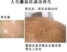取毛囊再生的生命物質(zhì),外涂于化學(xué)脫毛的白兔背部皮膚,毛發(fā)很快全部再生,而空白對(duì)照組毛發(fā)則很少再生。將毛囊再生物質(zhì),涂于禿頭的受試者,20天后,毛囊重新長(zhǎng)出,毛發(fā)可生長(zhǎng)1-2厘米長(zhǎng)。(詳見(jiàn)毛囊原位再生圖片介紹 圖7.28-7.31)