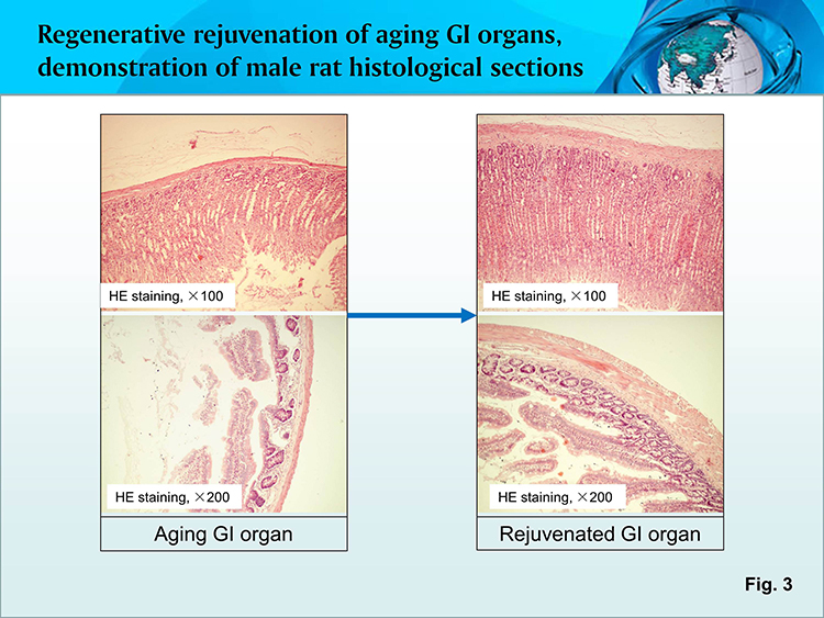 Core mechanism: The GI organ regenerative nutrients enable the tissue cells of prematurely aging GI organs and tissues to regain the stem cell development function and generate in situ new cells to replace the senescent and fibrotic cells and replenish the organ against the premature apoptosis of plenty of cells, regenerating and restoring all the prematurely aging GI organs to younger structure and function status. Attached below please find the histological rejuvenation images of animals and enteroscope images of regenerative rejuvenation of human aging GI (Fig. 3, 4).