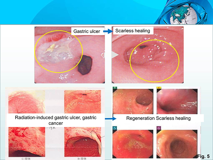 Core mechanism: Under the effect of orally administered regenerative nutritional composition for gastrointestinal ulcers, the ulcer tissue is gradually liquefied and discharged automatically to establish on the ulcer wound a physiologically ecological environment under which residual viable living tissue cells of the wound regenerate into stem cells in situ and regenerate defected gastrointestinal organ tissues in situ following the process of stem cell development.  Attached image shows the human GI ulcer wounds being regenerated and restored to physiological tissues and organs (Fig. 5).