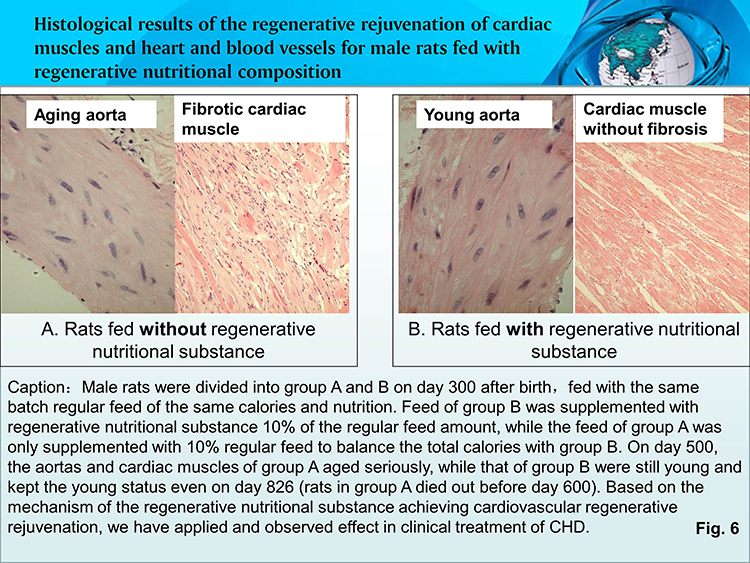 Core mechanism: Under the effect of orally administered regenerative nutritional composition for heart, all the fibrotic cells in heart vessels and cardiac muscles are gradually replaced by in situ regenerated new cells, and accordingly the blood-supply function of heart vessels is enhanced and the cardiac muscle has a younger structure and vitality. Attached below (Fig. 6) is the image of research result.
