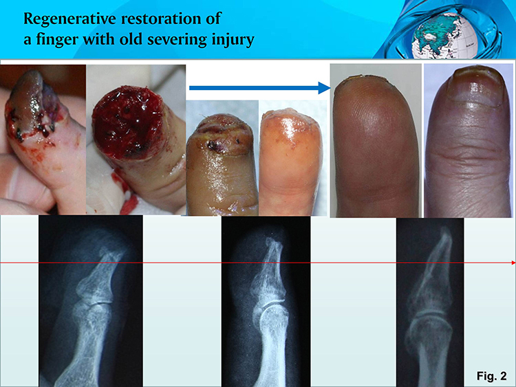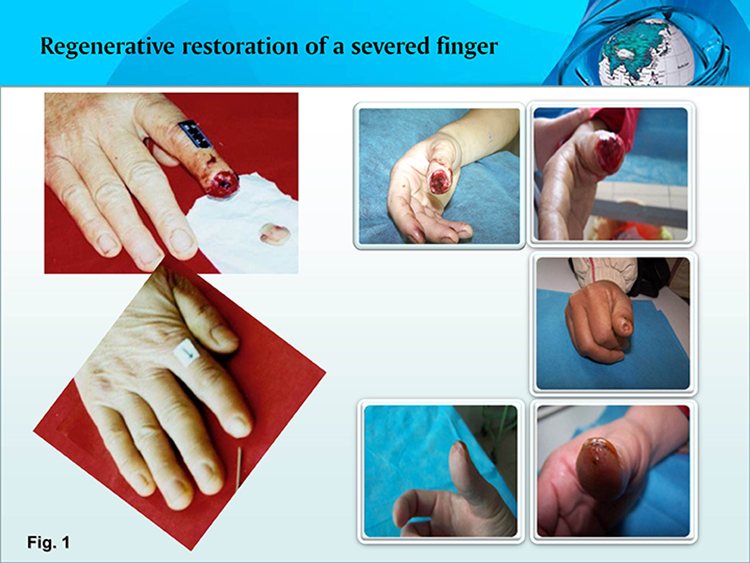 Core mechanism: All types of tissue cells of the fracture surface of a severed finger convert in situ into stem cells which regenerate synchronically all types of damaged tissues to form the original finger according to the in situ human stem cell development procedures. Attached below is the image illustrating the results of regenerative restoration of severed fingers (Fig. 1, 2).