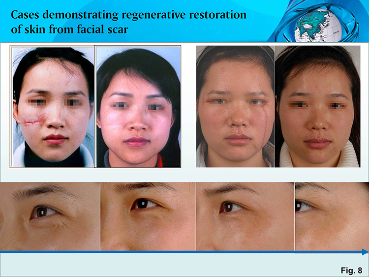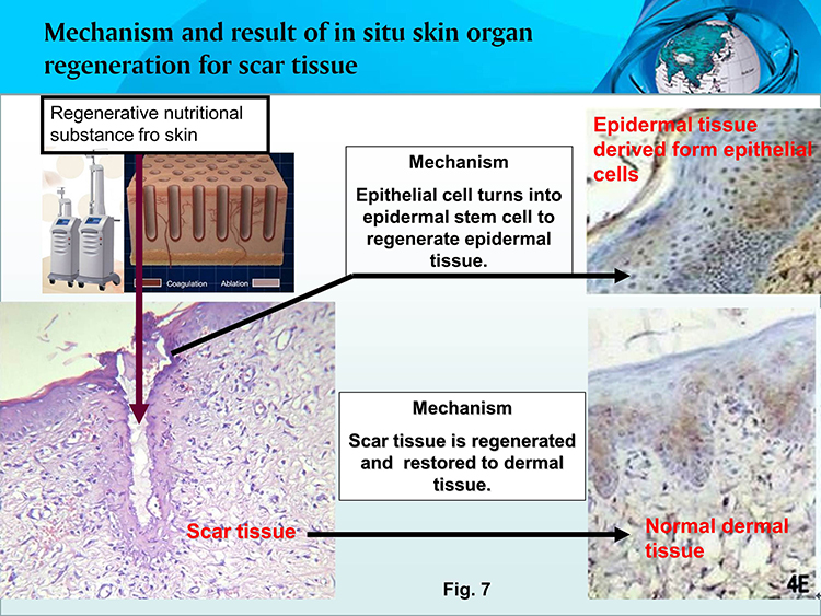 Core mechanism: Under the effect of regenerative nutritional composition for skin, the scar cells go into the process of apoptosis, while residual tissue cells of dermal and epidermal skin cells develop stem cell functions in situ, thus to regenerate new skin organ structure in situ. See figures below for accomplished human application results (Fig.7, 8).