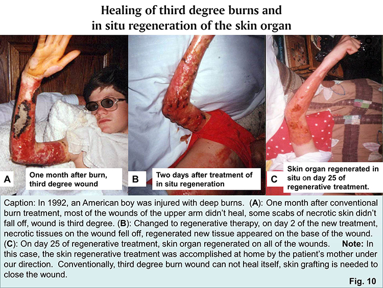 Core mechanism:   For deep burn wounds, under the function of skin regenerative substance, necrotic tissues can be liquefied and removed without further damage; the tissues in burn stasis zone can be restored; and an ecological enclosed environment can be established where the residual viable tissue cells transform in situ into regenerative stem cells. Following the development procedures of stem cells, the regenerative stem cells regenerate in situ skin tissues and organs. The mechanism applies to other types of wounds. Examples for accomplished human application results are attached below (Fig. 9, 10).