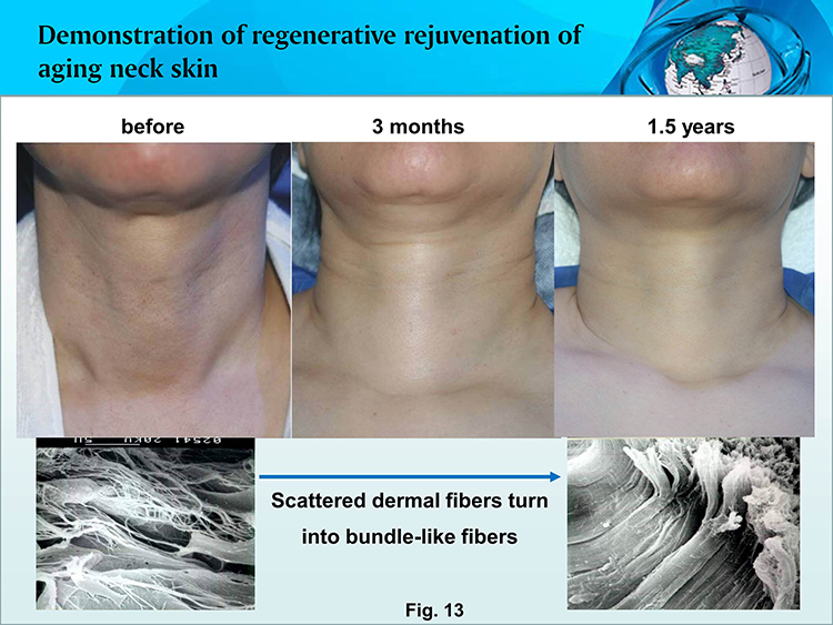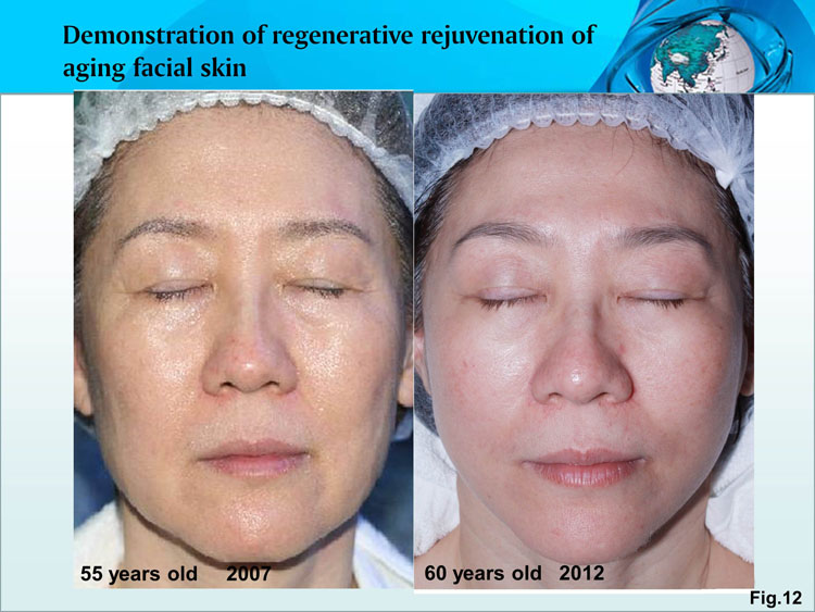 Core mechanism: Under the function of the regenerative rejuvenation nutrients for senescent skin, the epidermal regenerative capacity of epidermal basal cells is firstly restored and then the scattered fibers are restored to be bundle-like, awakening in situ the regenerative function of tissue cells and further regenerating in situ new dermal cells taking the place of senescent dermal cells, thus the young structure and function of dermis are rejuvenated.  Attached are the accomplished human application results (Fig. 11-13).