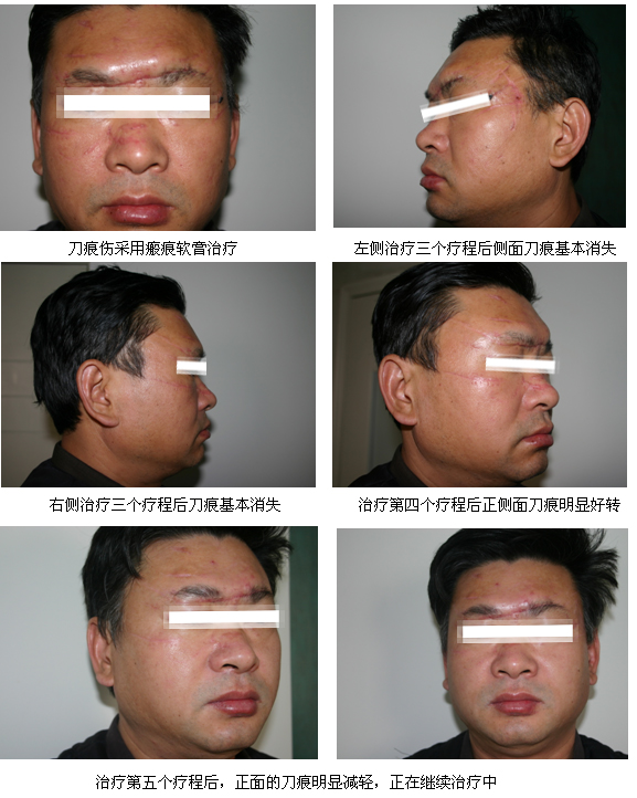 病例二:程某 ,男 ,27歲,農(nóng)民 。該患2010年2月誤被刀砍傷面部,傷口愈合后刀痕明顯,無(wú)法面對(duì)正常生活,逐產(chǎn)生輕生念頭。家人四處求醫(yī)為其治療,效果都不理想。2010年8月10日,該患接受河南大學(xué)附屬南石醫(yī)院采用原位再生醫(yī)療技術(shù)治療,治療效果滿(mǎn)意。如下圖。