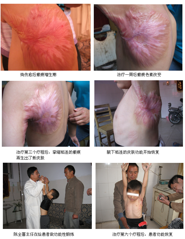 病例三:張某,男,6歲。該患2010年1月9日被炮火燒傷,住院90天,傷面封閉。該患創(chuàng)面愈合后出現(xiàn)瘢痕增生、粘連、攣縮,功能發(fā)生障礙,胳膊不能上舉?;颊邆?個(gè)月在安陽(yáng)市滑縣第三人民醫(yī)院接受皮膚再生醫(yī)療技術(shù)治療,經(jīng)治療6個(gè)療程,患肢功能已恢復(fù),瘢痕增生部分正在逐步消失,色素逐漸淡化。圖片如下。