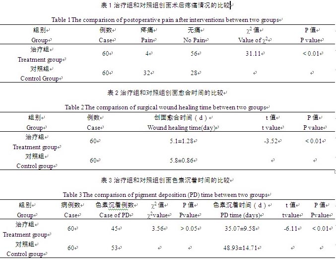 采用常規(guī)碘酒、酒精消毒創(chuàng)面,術區(qū)局部用0.5%利多卡因生理鹽水溶液浸潤麻醉,然后用雙波長脈沖調(diào)Q激光(長春光機所生產(chǎn)的YQ400-A/BI)進行治療,激光臨床參數(shù)的設定依據(jù)病變調(diào)整,激光的波長、能量密度、光斑、脈寬和頻率應根據(jù)患者的年齡、膚色、病變部位、病變顏色進行設定;本激光有532 nm和1064 nm兩個波長。激光治療完畢后,按照皮膚原位再生醫(yī)療技術進行創(chuàng)面處理:不使用刺激性消毒液,用無菌生理鹽水清洗干凈。然后治療組采用美寶濕潤燒傷膏外涂,可用壓舌板或棉簽將其均勻涂抹于創(chuàng)面,厚1 mm~2 mm,4 h~6 h換藥1次,每次涂藥前將創(chuàng)面殘留的藥物和滲出物清除干凈,可先用無菌生理鹽水清洗創(chuàng)面,然后涂美寶濕潤燒傷膏,應時刻保持創(chuàng)面呈濕潤狀態(tài),防止創(chuàng)面結痂,直至創(chuàng)面愈合。對照組采用1%紅霉素軟膏外涂(涂藥厚度、換藥時間、創(chuàng)面清洗等和治療組相同),直至創(chuàng)面愈合。兩組均觀察記錄創(chuàng)面愈合時間、術后疼痛情況,并隨訪6個月至9個月,觀察創(chuàng)面色素沉著情況。創(chuàng)面愈合后叮囑患者注意防曬,以避免色素沉著,同時服用維生素c減輕色素沉著。