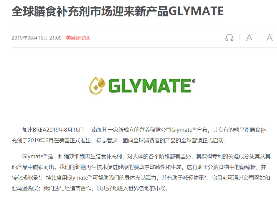 加州BREA2019年8月16日 -- 南加州一家新成立的營(yíng)養(yǎng)保健公司Glymate™宣布,其專有的糖平衡膳食補(bǔ)充劑于2019年6月在美國(guó)正式推出,標(biāo)志著這一面向全球消費(fèi)者的產(chǎn)品的全球營(yíng)銷正式啟動(dòng)。