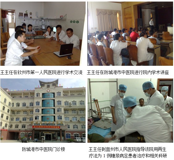 10月19日,王主任一行應(yīng)邀首先來的平南縣人民醫(yī)院,平南縣是廣西一人口大縣,全縣人口達(dá)一百二十萬人,平南縣人民醫(yī)院每年都會收治大量的燒傷病人和創(chuàng)瘍性病人。該院領(lǐng)導(dǎo)特別是副院長兼外科主任臧德源兼高對此次培訓(xùn)高度重視,王洪生主任應(yīng)邀于2009年10月19日下午2時30分,在該院以《再生療法在燒傷及難治性創(chuàng)傷.潰瘍創(chuàng)面治療新進(jìn)展》及《燒傷皮膚原位復(fù)原技術(shù)臨床規(guī)范化應(yīng)用及大面積燒傷全身治療要點》進(jìn)行了專題講座;10月20日,王洪生主任一行應(yīng)貴港市中醫(yī)院院長韋赤勇和副院長李超章之邀,對該院1例糖尿病足、1例褥瘡和1例開放性骨折內(nèi)固定術(shù)后切口皮膚壞死、鋼板及骨外露患者分別進(jìn)行會診及跟蹤臨床指導(dǎo),并利用在骨科及創(chuàng)傷外科查房的間隙,應(yīng)韋赤勇院長和副院長李超章的邀請,王主任對包括該院骨科、創(chuàng)傷外科主任、副主任在內(nèi)的相關(guān)專家和醫(yī)生進(jìn)行了《再生療法在難治性創(chuàng)傷.潰瘍創(chuàng)面治療新進(jìn)展》科室臨床技術(shù)培訓(xùn);10月21日,王洪生主任應(yīng)欽州市第一人民醫(yī)院副院長兼普外科主任李鋒主任醫(yī)師之邀,對該院燒傷整形科醫(yī)生及內(nèi)分泌科主任進(jìn)行了一期《再生療法在難治性創(chuàng)傷潰瘍創(chuàng)面治療新進(jìn)展》科室臨床技術(shù)培訓(xùn)和科室查房,在欽州市第一人民醫(yī)院進(jìn)行臨床學(xué)術(shù)交流期間,王主任還與李鋒副院長就該院進(jìn)行的針式內(nèi)鏡甲狀腺切除術(shù)手術(shù)創(chuàng)口應(yīng)用美寶創(chuàng)面速愈貼預(yù)防內(nèi)鏡創(chuàng)口術(shù)后增生性瘢痕進(jìn)行科研協(xié)作達(dá)成有關(guān)意向;10月22日,王洪生主任應(yīng)防城港市中醫(yī)院院長徐奎、院長助理兼外科主任陳國峰及大外科主任莫志和主任之邀,在該院以《再生療法在燒傷及難治性創(chuàng)傷潰瘍創(chuàng)面治療新進(jìn)展》為題進(jìn)行了專題學(xué)術(shù)講座,在講課間隙還對該院一個褥瘡病人進(jìn)行會診;10月23日,王洪生主任應(yīng)宜州市人民醫(yī)院院長兼微創(chuàng)外科治療中心主任黃仲海副主任醫(yī)師的邀請,為該院1例糖尿病足患者進(jìn)行會診和指導(dǎo)該院進(jìn)行再生療法在糖尿病足的臨床療效觀察科研項目,在宜州市人民醫(yī)院期間,黃仲海院長還組織該院骨科、燒傷整形科、普外科、創(chuàng)傷外科微創(chuàng)外科(腹腔鏡、宮腔鏡、輸尿管鏡)治療中心、手術(shù)室、麻醉科的全體專家和醫(yī)護(hù)人員就再生療法在燒傷及難治性創(chuàng)傷潰瘍創(chuàng)面治療新進(jìn)展及美寶創(chuàng)面速愈貼預(yù)防手術(shù)切口增生性瘢痕等專題進(jìn)行了臨床學(xué)術(shù)交流,并就該院新近成立的微創(chuàng)外科治療中心應(yīng)用美寶創(chuàng)面速愈貼預(yù)防內(nèi)鏡創(chuàng)口術(shù)后增生性瘢痕開展科研協(xié)作達(dá)成共識。