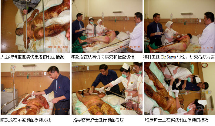3、8月3日下午,陳教授一行完成了在Fatmawati hospital的培訓(xùn)任務(wù)后,馬上又應(yīng)邀到雅加達(dá)市的Harapan Bunda hospital會診、指導(dǎo)一例大面積特重度燒傷的患者。該患者是一名男性,47歲。因被火焰燒傷全身而入院。臨床診斷:1、大面積特重度燒傷(75%TBSA深I(lǐng)I度---深I(lǐng)II度);2、中度吸入性損傷。由于患者燒傷面積大、深度深,且是該院收治的第一例特重度燒傷患者,為了更好地使用燒傷再生醫(yī)學(xué)技術(shù)治療該患者,醫(yī)院特地邀請陳教授對該患者進(jìn)行會診和指導(dǎo)。陳教授到了病房后首先聽取了病情匯報,然后認(rèn)真詢問了病史、查閱了病歷資料、護(hù)理記錄和進(jìn)行了細(xì)致的體格檢查,并結(jié)合該病例的具體傷情和情況,提出了一整套具體的全身系統(tǒng)治療和創(chuàng)面治療方案。討論和制定了治療方案后,陳教授親自為大家示范了深度燒傷痂皮的耕耘減張技術(shù)和燒傷濕潤暴露療法的創(chuàng)面治療方法。