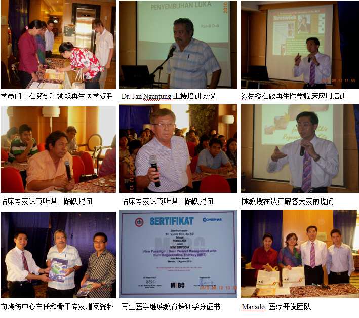6、8月12日上午9時,由醫(yī)師學(xué)會主辦的Manado省級燒傷再生醫(yī)學(xué)臨床培訓(xùn)班(省級繼續(xù)教育項目,學(xué)分8分)在Aston Hotel酒店的會議室里舉辦,來自全省主要的4個城市的8家政府醫(yī)院和其它20多家私營醫(yī)院的89名臨床醫(yī)師、護(hù)士參加了這次培訓(xùn)會。培訓(xùn)會由Manado 總醫(yī)院燒傷整形外科主任Dr. Jan Ngantung主持,陳教授應(yīng)邀作了“燒傷再生醫(yī)學(xué)與療法在燒傷、創(chuàng)瘍疾病治療的臨床規(guī)范應(yīng)用”的培訓(xùn)演講,很受大家的歡迎,達(dá)到了較理想的培訓(xùn)效果。