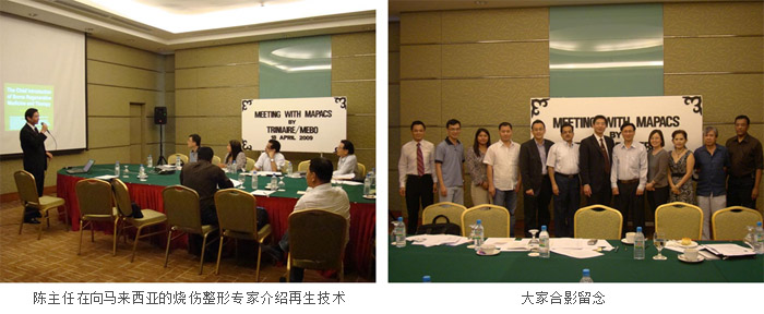 2009年4月18日,馬來西亞2009年燒傷整形外科常務委員會議在吉隆坡Boulevard Hotel召開,參加會議的有來自各州、省、市的重要的燒傷、整形專家約15人。陳永翀主任應邀參加會議,并以“The chief introduction of burns regenerative medicine and therapy”為題進行專題報告,在陳主任的30分鐘的演講中,向各位燒傷整形專家闡述了全厚皮燒傷通過激活潛能再生細胞轉化為干細胞,然后利用干細胞培養(yǎng)再生技術實現原位再生復原皮膚器官的過程,同時向大家展示了眾多的大面積特重度燒傷的臨床病例,大家聽后非常興奮和激動,各位專家爭先恐后地舉手提問,陳主任和助手們則逐一進行解答,大家還紛紛詢問何時能夠買到MEBO和引進該技術,提問和討論階段占了1個半小時。最后,燒傷學會主席Dr. Peter Wong向陳永翀主任發(fā)出邀請,邀請陳主任出席2010由馬來西亞燒傷學會主辦的在馬來西亞Kuching市召開的亞洲燒傷整形大會并做專題演講。
