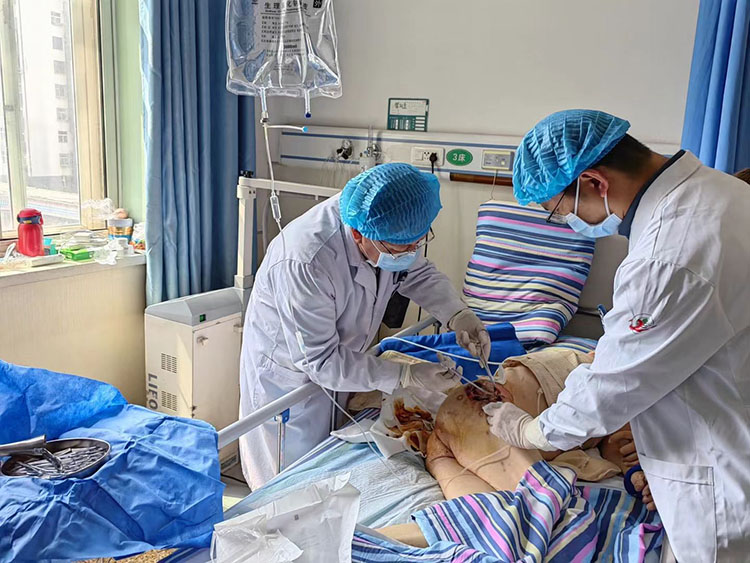 2024年3月27日,《中國燒傷創(chuàng)瘍雜志》編委、燒傷創(chuàng)瘍?cè)偕t(yī)療技術(shù)臨床專家張強(qiáng),應(yīng)邀到訪湖北宜昌國藥葛洲壩中心醫(yī)院呼吸內(nèi)科,與朱念護(hù)士長,傷口小組盧婷婷老師共同會(huì)診一例下肢高度水腫引起張力性水皰破潰形成的潰瘍創(chuàng)面的高齡患者。張主任同大家分析了創(chuàng)面滲液原因,張主任建議應(yīng)用再生醫(yī)療技術(shù)規(guī)范換藥,示范了水皰處理方式及換藥方法。受到患者的感謝和高度贊揚(yáng)。