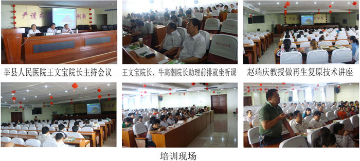 2012年7月3日,經(jīng)由魯西莘縣由衛(wèi)生局批準(zhǔn),莘縣人民醫(yī)院牽頭,成功地舉辦了一期再生復(fù)原技術(shù)培訓(xùn)班。培訓(xùn)對象主要來自莘縣人民醫(yī)院、莘縣中醫(yī)院、莘縣婦幼保健院外科、骨科、急診科、婦科的醫(yī)務(wù)骨干56人。會議由莘縣人民醫(yī)院王文寶院長主持。牛高潮院長助理在培訓(xùn)前介紹了培訓(xùn)班的籌備情況。