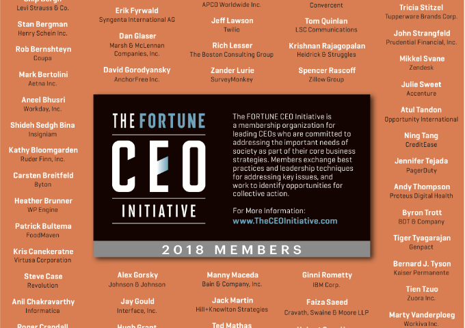 《財(cái)富》CEO倡議是《財(cái)富》雜志在2017年成立的組織,從財(cái)富500強(qiáng)中挑選出104位CEO商討商業(yè)組織如何通過共同合作在創(chuàng)造財(cái)富的同時(shí)使世界變得更好。這也是響應(yīng)2016年教皇方濟(jì)各對(duì)財(cái)富500強(qiáng)的期望-其中的精英CEO、學(xué)者和慈善家們能夠合作為世界貧困問題提供解決策略來促進(jìn)世界繁榮。