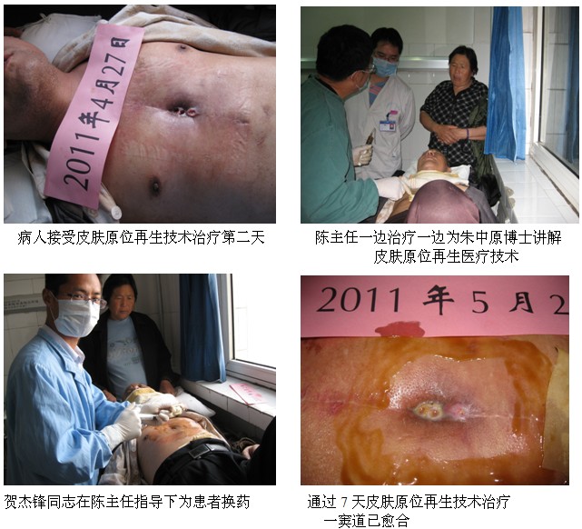 通過陳主任皮膚原位再生技術(shù)的闡述,在場的會診專家組成員均被原位再生醫(yī)療技術(shù)深深的折服,最后經(jīng)過集體會診研究決定,將該患交給陳全喜主任親自帶領(lǐng)該患的主治醫(yī)師、博士朱中原采用皮膚原位再生醫(yī)療技術(shù)為該患治療。換藥后第七天,患者傷口疼痛明顯減輕,體溫恢復(fù)正常,3個竇道中,其中一個竇道已接近愈合,患者正在進(jìn)一步的治療康復(fù)中。
