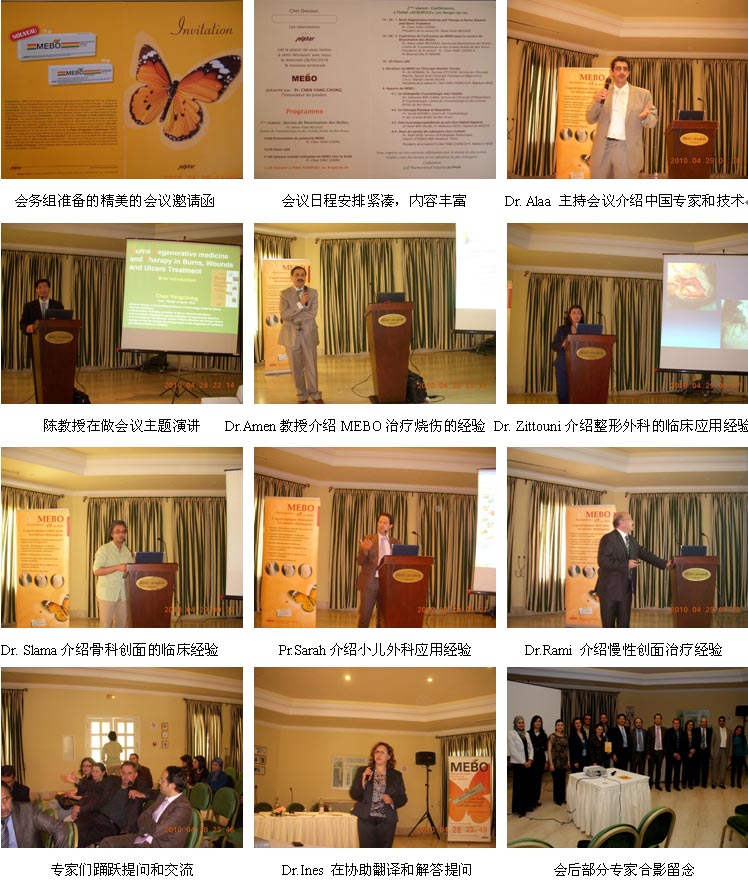 3、2010年4 月29日,突尼斯國家級燒傷、創(chuàng)傷外科學術交流會在Acropole Hotel會議室舉辦, 學術交流會有Dr.Alaa Haleil主持,來自全國3個主要城市的10多家醫(yī)院的30多名燒傷、整形、創(chuàng)傷外科醫(yī)師參加了學術交流會,陳教授以“Burns Regenerative Medicine and Therapy in Burns, Wounds and Ulcers treatment” 為題做了主題演講。另外,還有6名專家教授在交流會上介紹了他們近年來應用MEBO治療燒傷、創(chuàng)傷和潰瘍的臨床經(jīng)驗,學術氛圍濃厚,大家都覺得這是一次非常難得的交流和學習的機會,希望以后每次學術年會都有新技術和好經(jīng)驗的介紹和交流。