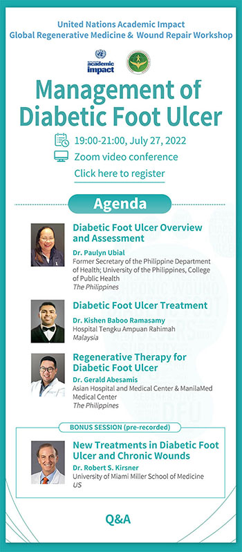 2022年7月27日,由國際再生醫(yī)學(xué)與創(chuàng)面修復(fù)學(xué)會(huì)(ISRMWR)主辦的“聯(lián)合國學(xué)術(shù)影響力國際再生醫(yī)學(xué)線上培訓(xùn)——糖尿病足管理”順利舉行。此次培訓(xùn),共有來自全球近300名醫(yī)務(wù)工作者注冊(cè)參會(huì),參會(huì)人員來自中國、馬來西亞、印尼、印度、菲律賓、新加坡、秘魯、厄瓜多爾等國。
