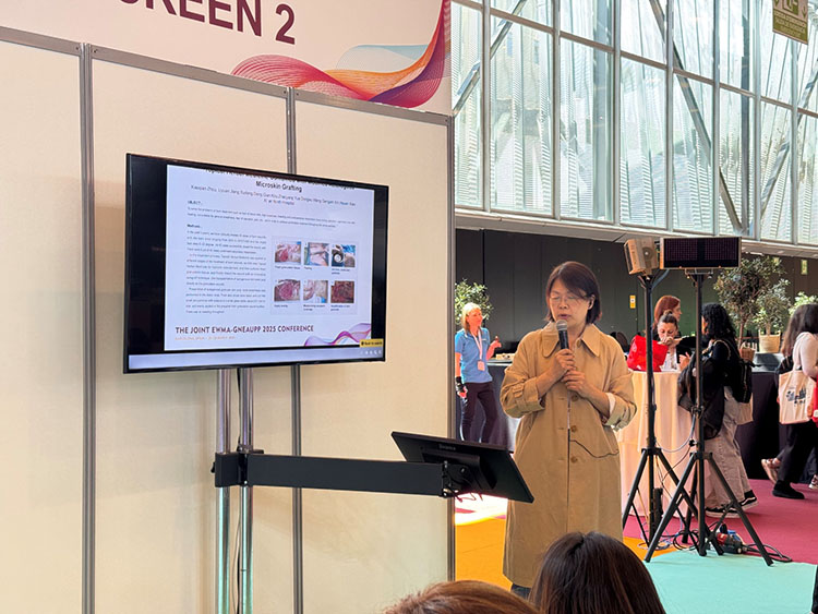 除展臺的展示外,再生醫(yī)療技術(shù)更是在會議中掀起一次次學術(shù)浪潮。大會首日下午,題為“重塑創(chuàng)面治療:從臨床實踐到技術(shù)創(chuàng)新”的再生醫(yī)療技術(shù)研討會順利召開。作為推動克林頓全球倡議(CGI)——“歐洲修復計劃:賦能歐洲再生醫(yī)療網(wǎng)絡構(gòu)建”的又一關(guān)鍵活動,研討會圍繞再生醫(yī)療技術(shù)在急慢性創(chuàng)面中的創(chuàng)新應用展開討論。來自沙特 Sulaiman Al Habib醫(yī)療集團外科的Ziad Dalloul首先分享了馬喬林潰瘍的臨床管理策略,深入探討了再生醫(yī)療技術(shù)在復雜創(chuàng)面中的應用及優(yōu)勢。隨后,西安市第九醫(yī)院燒傷整形科周小茜帶來了應用自創(chuàng)微粒皮漿種植結(jié)合再生醫(yī)療技術(shù)治療慢性創(chuàng)面的演講,充分展示了該技術(shù)在促進慢性創(chuàng)面愈合中的優(yōu)勢。最后,來自菲律賓Quirino Memorial醫(yī)療中心燒傷科的Nikki Valencia分享了一項最新的系統(tǒng)回顧,全面證實了再生醫(yī)療技術(shù)在燒傷治療中的綜合療效、安全性、疼痛緩解及感染預防方面的顯著療效。