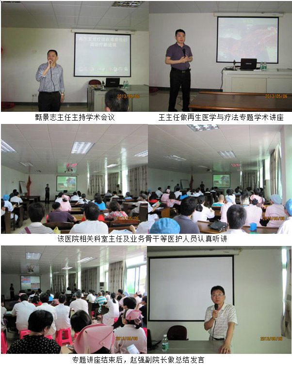 2013年5月6日下午,中國燒傷創(chuàng)瘍雜志副總編輯、中國中西醫(yī)結(jié)合學(xué)會燒傷專業(yè)委員會常委兼秘書、北京燒傷創(chuàng)瘍研究所副所長、臨床研究部主任王洪生研究員應(yīng)邀來到臺山市中醫(yī)院作專題為“再生復(fù)原療法在燒傷在難愈性創(chuàng)瘍創(chuàng)面治療新進(jìn)展”的學(xué)術(shù)報告。會議由外科甑景志主任主持,趙強(qiáng)副院長及各相關(guān)科室主任、業(yè)務(wù)骨干等醫(yī)護(hù)人員參加了學(xué)術(shù)講座。王主任的專題學(xué)術(shù)報告分為三部分,在第一部分概述中,王主任重點(diǎn)講述了我國著名生命科學(xué)家、醫(yī)學(xué)家徐榮祥教授近年來在人體再生復(fù)原科學(xué)研究領(lǐng)域所取得的重大臨床及實(shí)驗(yàn)研究成果,2012年分別發(fā)表在《英國外科雜志》和《國際燒傷雜志》2篇綜述中有關(guān)磺胺嘧啶銀及含銀敷料等外用銀制劑用于急性創(chuàng)傷和燒傷創(chuàng)面會造成創(chuàng)面愈合延遲、增加疼痛和感染率的最新觀點(diǎn),以及再生復(fù)原療法的概念及其解決難愈性創(chuàng)面治療的機(jī)理;第二部分重點(diǎn)介紹了再生復(fù)原療法創(chuàng)面規(guī)范的處理方法;第三部分重點(diǎn)講述了再生復(fù)原療法在各類難愈性創(chuàng)瘍創(chuàng)面治療要點(diǎn)及典型病例介紹,并結(jié)合大量的病例圖片講解了各類深度燒傷創(chuàng)面、再生醫(yī)療技術(shù)在骨外露、鋼板外露、糖尿病足、動脈閉塞癥、撕脫傷、斷肢再生、手術(shù)切口感染、褥瘡等各種難愈合創(chuàng)面的治療過程及要點(diǎn)。會議結(jié)束時趙強(qiáng)副院長做總結(jié)發(fā)言,會后,趙強(qiáng)副院長,外科甑景志主任,骨科陳主任和手外科醫(yī)生等就一些學(xué)術(shù)和臨床技術(shù)方面分別向王主任請教。王主任分別做了耐心而細(xì)致的解答。