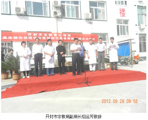 活動啟動儀式在醫(yī)院的精心組織下準時舉行。開封市宗教局紹運芳副局長,開封市天主教柴玉良、趙水泉神父,天主教仁愛置業(yè)公司經(jīng)理連汴生先生,中國燒傷創(chuàng)瘍科技中心醫(yī)療部主任金黨軍先生,河南省中西醫(yī)結(jié)合學會燒傷專業(yè)委員會秘書長陳全喜先生,開封美寶燒傷創(chuàng)瘍空分醫(yī)院院長王文芳、副院長李明等參加了啟動儀式。