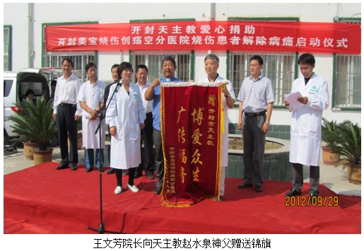 此次與開封美寶燒傷創(chuàng)瘍空分醫(yī)院合作愛心救助活動,源于愛心人士孫先生的倡議??辗轴t(yī)院二十多年來采用國際領(lǐng)先的美寶再生復原技術(shù)治療燒傷、創(chuàng)瘍,以療效好、無痛苦、深二度以下不留疤而著稱。不久前,孫先生的女兒不慎被開水燙傷,慕名來到我院,得到醫(yī)護人員的精心治療,孩子的創(chuàng)面平整修復、無疤痕并且治療全程無痛苦,這著實讓他感受到和見證了美寶再生技術(shù)的神奇療效和該院良好的醫(yī)德醫(yī)風。在孫先生的倡議下,開封市天主教愛心人士捐出善款為開封美寶燒傷創(chuàng)瘍空分醫(yī)院的燒傷患者提供三天免費的就診醫(yī)療費用。凡在2012年9月29日至10月1日到開封美寶燒傷創(chuàng)瘍空分醫(yī)院就醫(yī)的門診、住院燒傷患者均可享受免費就診服務。