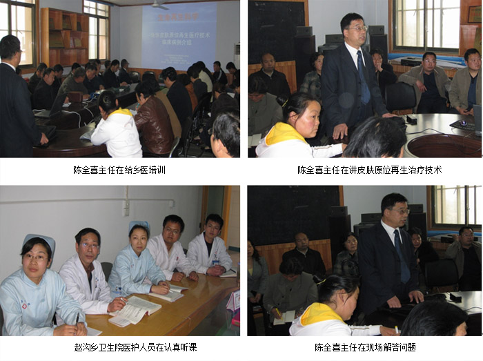 陽春三月好風(fēng)光,綠樹碧海百花香。送醫(yī)送藥送健康,翻山越嶺到山鄉(xiāng)。為響應(yīng)黨中央國務(wù)院號召的“三下鄉(xiāng)、三進社區(qū)送醫(yī)、送文化、送健康”活動,2009年4月13日早上6:30,北京燒傷創(chuàng)瘍研究所陳全喜主任、中國中西醫(yī)結(jié)合學(xué)會燒傷專業(yè)委員會駐河南省辦事處主任趙俊國二人已經(jīng)坐上了首班公交車,肩負(fù)著普及“皮膚原位再生復(fù)原技術(shù)”的重任,懷著早一分鐘讓廣大創(chuàng)傷、燒傷患者減少痛苦,減少致殘率,減少醫(yī)療費的開支的心情,踏上了去鄭州中原區(qū)溝趙鄉(xiāng)中心衛(wèi)生院的路,在上午8:30準(zhǔn)時到達(dá)了趙溝鄉(xiāng)中心醫(yī)院。在鄉(xiāng)衛(wèi)生院三樓會議室內(nèi),來自43個行政村的鄉(xiāng)醫(yī)和15名鄉(xiāng)衛(wèi)生院大夫聚集一堂,他們互相交流著什么?衛(wèi)生院李院長熱情的接待了陳全喜、趙俊國兩位主任,并向大家講道:他們是按照黨中央、國務(wù)院三下鄉(xiāng)的指示精神,送醫(yī)、送藥、送健康來了,他們把國家最先進的技術(shù)和新產(chǎn)品送來了,是免費為我們鄉(xiāng)的7.5萬農(nóng)民服務(wù)的?!?nbsp;  在熱烈的掌聲中,陳全喜主任向大家問候并溫謁的說:“謝謝鄉(xiāng)衛(wèi)生院的領(lǐng)導(dǎo)和各位大夫,我們響應(yīng)黨中央、國務(wù)院三下鄉(xiāng)”號召,為溝趙鄉(xiāng)7.5萬農(nóng)民服務(wù)來了。我們要把在國際、國內(nèi)最領(lǐng)先的技術(shù)、最新的產(chǎn)品,送給您們。這是我們的義務(wù)和責(zé)任?!睙崃业恼坡曊駝又績?nèi)四壁白墻,碟影在墻壁上顯示著:第一章:“皮膚原位再生復(fù)原技術(shù)理論”;第二章:操作方法;第三章藥理的作用與用途;第四章臨床病例圖片展示等培訓(xùn)直到上午11:40分才結(jié)束。趙俊國主任把“速愈貼”的樣品送給了各位醫(yī)生,并相互留影,并統(tǒng)計了大家的聯(lián)系方式。此次培訓(xùn)不但向醫(yī)生們傳送了新技術(shù),也是解除患者痛苦的一件善事,二人心情愉快的踏上了下一站的征途。