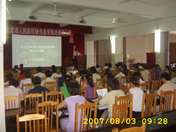 2007年8月3日,由中國中西醫(yī)結(jié)合學(xué)會燒傷專業(yè)委員會主辦,廣西北流市衛(wèi)生局、北流市人民醫(yī)院承辦的燒傷醫(yī)學(xué)新進(jìn)展學(xué)習(xí)班在北流市人民醫(yī)院大會議廳舉行。來自北流市人民醫(yī)院、北流市中醫(yī)院、北流市骨科醫(yī)院、北流市西山醫(yī)院、北流市陵城醫(yī)院等市、區(qū)、鄉(xiāng)鎮(zhèn)26家各級醫(yī)療單位的100余名院長、科主任、相關(guān)專業(yè)的專家和醫(yī)護(hù)人員參加了這次學(xué)習(xí)班。學(xué)習(xí)班開始前,舉行了簡短的開幕式,北流市人民醫(yī)院院長兼北流市骨科醫(yī)院院長王卡琳主持開幕式并致開幕詞,他在致詞中對學(xué)習(xí)班在北流市及本醫(yī)院召開表示祝賀、對與會的各醫(yī)院代表表示慰問、對應(yīng)邀到會做專題講座的中國中西醫(yī)結(jié)合學(xué)會燒傷專業(yè)委員會常委、北京美寶燒傷創(chuàng)瘍研究所副所長、醫(yī)療部主任王洪生表示感謝,對生命再生醫(yī)學(xué)的創(chuàng)立者、燒傷皮膚原位再生醫(yī)療技術(shù)的發(fā)明人、我國著名的生命科學(xué)家、醫(yī)學(xué)家徐榮祥教授近年來在生命再生科學(xué)及燒傷再生醫(yī)學(xué)領(lǐng)域所取得的重大實(shí)驗(yàn)及臨床科研成果給予了高度評價(jià),同時(shí)強(qiáng)調(diào)希望參加學(xué)習(xí)班的醫(yī)護(hù)人員抓住這次難得的學(xué)習(xí)機(jī)會,認(rèn)真聽講,把學(xué)到的新技術(shù)盡快應(yīng)用到臨床工作中去。