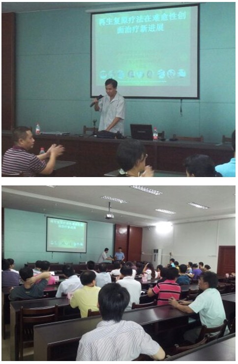 2012年7月30日,應(yīng)該院熱情的邀請(qǐng),中國(guó)中西醫(yī)結(jié)合學(xué)會(huì)燒傷專(zhuān)業(yè)委員會(huì)常委兼秘書(shū)、《中國(guó)燒傷創(chuàng)瘍雜志》副總編輯、北京美寶燒傷創(chuàng)瘍研究所副所長(zhǎng)、第二臨床研究部主任王洪生研究員來(lái)到該院,作學(xué)術(shù)和技術(shù)上的交流和探討。下午3時(shí),在醫(yī)務(wù)科潘主任的主持下會(huì)議開(kāi)始,全院職工各科室70余名相關(guān)專(zhuān)業(yè)的醫(yī)護(hù)人員到會(huì)認(rèn)真學(xué)習(xí)傾聽(tīng)王主任 “再生復(fù)原療法在深度燒傷及難愈性創(chuàng)面治療新進(jìn)展”專(zhuān)題學(xué)術(shù)講座,在學(xué)術(shù)講座中,王主任結(jié)合大量真實(shí)的臨床病例圖片和圖像,針對(duì)不同深度的燒傷創(chuàng)面及各類(lèi)難愈性創(chuàng)傷、潰瘍創(chuàng)面的規(guī)范化處理方法與技巧、注意事項(xiàng)等進(jìn)行了細(xì)致地講解,強(qiáng)調(diào)創(chuàng)面處理要大膽清創(chuàng)、減壓、去除壞死組織,并保持創(chuàng)面生理的濕潤(rùn)環(huán)境,實(shí)現(xiàn)創(chuàng)面的再生復(fù)原,并建議對(duì)病人深達(dá)真皮層以下愈合后創(chuàng)面應(yīng)進(jìn)行防疤處理治療.會(huì)議得到會(huì)議人員的高度贊揚(yáng)。