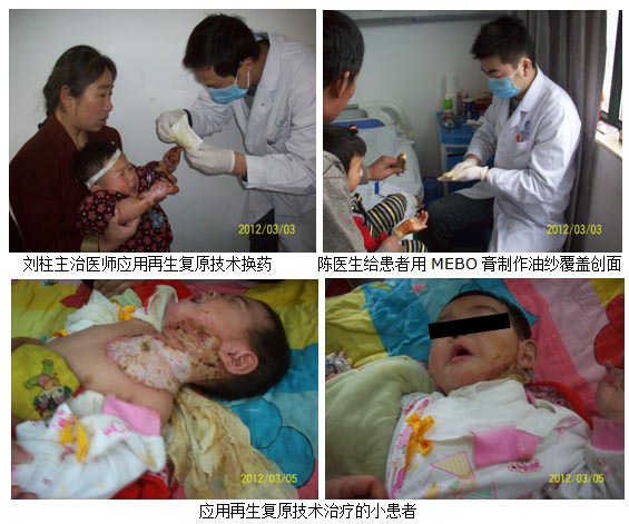 2011年11月14日~17日,杜福勤主任再次來到燒傷整形科,在齊國選主任的帶領(lǐng)下看望了住院的燒傷和整形患者,并給予再生技術(shù)規(guī)范換藥。15日給予示范換藥治療后,得到患者及家屬的認(rèn)可和歡迎,特別是幼兒患者,應(yīng)用再生技術(shù)換藥后患兒立即停止哭鬧。16日,應(yīng)用MEBO創(chuàng)瘍貼給頸胸部燙傷患兒和上下肢燒傷植過自體皮的患兒換藥治療,收到了良好的臨床效果。