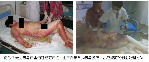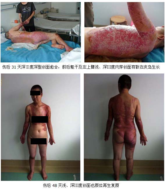 因該患者是該醫(yī)院于2007年成立燒傷外科以來(lái)收治傷情最嚴(yán)重的大面積燒傷患者,為確保對(duì)該患者的成功救治,2011年5月4日,應(yīng)該醫(yī)院邀請(qǐng)中國(guó)中西醫(yī)結(jié)合學(xué)會(huì)燒傷專業(yè)委員會(huì)常委、中國(guó)燒傷創(chuàng)瘍雜志社副總編輯、北京燒傷創(chuàng)瘍研究所副所長(zhǎng)、臨床部主任王洪生研究員星夜兼程于當(dāng)日下午5時(shí)趕到該醫(yī)院為該例大面積燒傷患者會(huì)診,指導(dǎo)對(duì)該患者的救治工作。因該例大面積深度燒傷三度燒傷創(chuàng)面在30%以上,為確?;颊叩钠椒€(wěn)康復(fù),王主任分別于患者傷后7天、15天、31天,三下北海,全程跟蹤指導(dǎo)對(duì)患者的救治工作。經(jīng)過(guò)該科醫(yī)護(hù)人員近50天夜以繼日的精心治療,患者深Ⅱ度及淺Ⅲ度、深Ⅲ度創(chuàng)面經(jīng)全程規(guī)范應(yīng)用燒傷皮膚原位再生復(fù)原技術(shù),未植皮實(shí)現(xiàn)原位再生復(fù)原(生理性愈合)。
