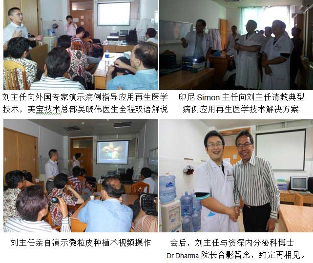 2012-9-17---2012-9-23日,為了進(jìn)一步了解和學(xué)習(xí)燒傷再生醫(yī)學(xué)在中國(guó)臨床上的應(yīng)用,來(lái)自印度尼西亞、馬來(lái)西亞和蒙古3個(gè)國(guó)家的醫(yī)生一行8人 在美寶國(guó)際市場(chǎng)集團(tuán)和印尼代理商Arif hamsah等多方前期制定的計(jì)劃安排下,齊聚廣州中西醫(yī)結(jié)合醫(yī)院參觀學(xué)習(xí)美寶再生醫(yī)學(xué)技術(shù),受到了醫(yī)院院長(zhǎng)以及科室主任和醫(yī)生們熱烈歡迎。