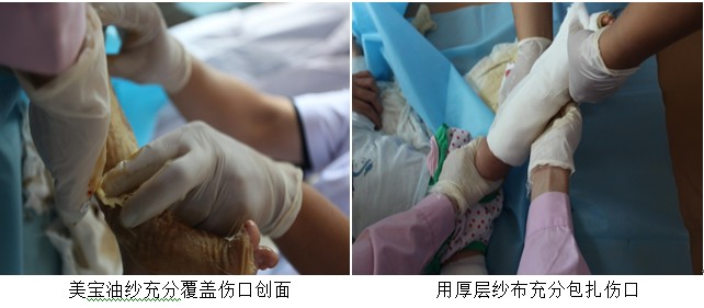 接下來(lái)我們看到的病人,是1個(gè)5個(gè)月大的小嬰兒,遇到沸水不幸,雙下肢燙傷其中左下肢較嚴(yán)重。