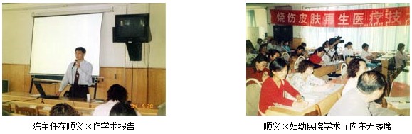 2004年5月20日,應(yīng)北京市順義區(qū)衛(wèi)生局的邀請(qǐng),中國(guó)燒傷創(chuàng)瘍科技中心陳主任在順義區(qū)婦幼醫(yī)院的學(xué)術(shù)廳作再生醫(yī)學(xué)學(xué)術(shù)報(bào)告,衛(wèi)生局主持了這次學(xué)術(shù)活動(dòng),參加學(xué)術(shù)活動(dòng)的有來(lái)自順義區(qū)醫(yī)院、中醫(yī)院、婦幼醫(yī)院等十多家醫(yī)院、鄉(xiāng)鎮(zhèn)衛(wèi)生院和診所的醫(yī)務(wù)人員50多人。大家聚精會(huì)神地聽(tīng)取學(xué)術(shù)報(bào)告并認(rèn)真作筆記,婦幼醫(yī)院科教信息科對(duì)學(xué)術(shù)報(bào)告進(jìn)行了全程錄像錄音,計(jì)劃改時(shí)間再次組織因搶救病人和值班不能到場(chǎng)的醫(yī)務(wù)人員進(jìn)行業(yè)務(wù)學(xué)習(xí)。