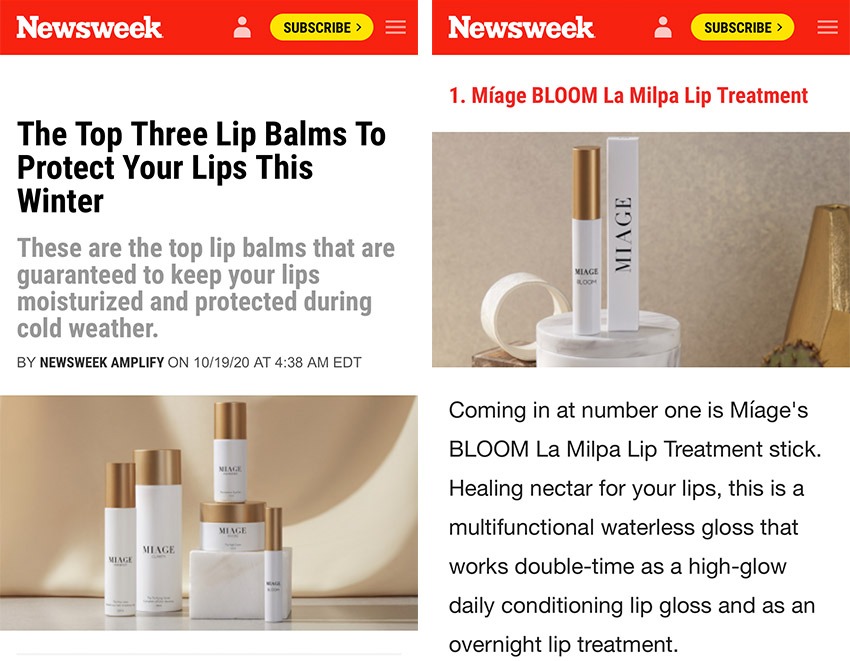 當(dāng)?shù)貢r(shí)間2020年10月19日,美國《新聞周刊》發(fā)文推薦秋冬季最值得擁有的三種護(hù)唇膏,排在首位的是被譽(yù)為唇部甘露的BLOOM多功能護(hù)唇膏,美寶集團(tuán)美國新品MIAGE系列之核心產(chǎn)品。