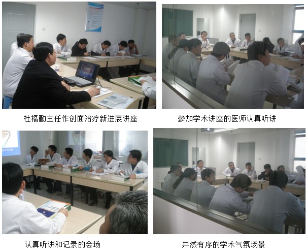 2012年10月24日下午14:30分中國(guó)中西醫(yī)結(jié)合學(xué)會(huì)燒傷專(zhuān)業(yè)委員會(huì)委員、北京美寶燒傷創(chuàng)瘍研究所臨床部杜福勤主任和學(xué)會(huì)駐安徽辦事處吳崇魏同志應(yīng)皖北總醫(yī)院燒傷整形科齊國(guó)軒主任的邀請(qǐng),為該院燒傷整形科、腦外科、骨科、泌尿外科、內(nèi)分泌科舉辦《中西醫(yī)結(jié)合創(chuàng)面治療新進(jìn)展》學(xué)術(shù)講座。參加講座學(xué)習(xí)的30余人認(rèn)真聽(tīng)取了杜福勤主任圖文并茂、通俗易懂的演講,會(huì)后解答了臨床遇到的實(shí)際問(wèn)題,講座進(jìn)行了二個(gè)多小時(shí),受到與會(huì)者的歡迎和好評(píng)。