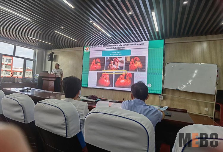 2022年9月6日,中國中西醫(yī)結(jié)合學(xué)會(huì)燒傷專業(yè)委員會(huì)醫(yī)療部張強(qiáng)主任應(yīng)邀到訪湖北宜昌宜都市中醫(yī)醫(yī)院骨外科,在科室張禹副主任主持下,進(jìn)行了《難治性創(chuàng)瘍的治療》講座,講解條理清晰,通過各類治療病例的展示,使理論深入淺出。醫(yī)師們表示受益頗多,并更加了解了再生醫(yī)療技術(shù)的發(fā)展前沿。科室交流結(jié)束后,張主任會(huì)診一例骨折后皮膚缺損骨外露患者。張主任建議患者創(chuàng)面應(yīng)用美寶再生醫(yī)療技術(shù)換藥,不僅生肌止痛,而且愈合效果理想,并為大家示范了規(guī)范換藥流程。