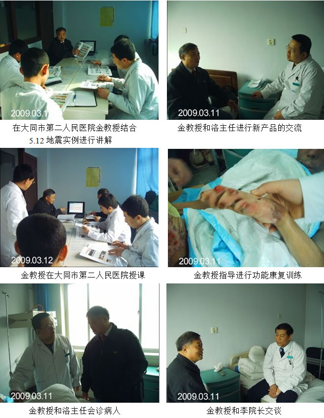 大同市地理位置十分重要,素有“北方鎖鑰”之稱,是我國中西部與東部連接線,是內(nèi)蒙古通往山西的咽喉,也是北京和華北平原的側(cè)背。這種獨特的區(qū)位優(yōu)勢,使大同成為中國中西部交匯處的一個具有多功能的區(qū)域性中心城市,2009年3月11日,金黨軍教授應(yīng)大同市第二人民醫(yī)院外科主任洛強的邀請來到了這里。地處大同市操場城街的大同市第二人民醫(yī)院是一家二甲醫(yī)院擁有床位400多張,醫(yī)護人員600余人,其中專業(yè)技術(shù)人員500多人,高級職稱專家80多人,臨床科室45個重點學(xué)科,達明眼科中心、骨科、愛心婦產(chǎn)中心、普外科、血液凈化中心、口腔中心、腦外科、神經(jīng)內(nèi)科、消化內(nèi)鏡中心、泌尿外科、呼吸內(nèi)科、心血管內(nèi)科、內(nèi)分泌科、整形燒傷外科、肛腸外科、針灸理療科、藥氧中心等均為大同市領(lǐng)先學(xué)科。 金教授到來后,首先向洛主任和其他醫(yī)護人員詳細了解病人在入院期間用藥和治療的詳細情況,并對他們提出的問題進行了詳細的解答。其后對病人的治療方案同洛主任進行了詳細的安排,金教授囑咐一定要嚴格按照皮膚器官原位再生復(fù)原技術(shù)的要領(lǐng)來為患者進行治療。之后金教授與剛剛打完點滴的李院長就皮膚器官原位再生復(fù)原技術(shù)的新產(chǎn)品速愈貼在臨床應(yīng)用知識進行了探討,并就速愈貼在其它醫(yī)院已經(jīng)取得的實際臨床效果進行了一系列展示,同時結(jié)合現(xiàn)在醫(yī)院的實際病例如何運用皮膚器官原位再生復(fù)原技術(shù)后取得的效果進行了長時間的交流。一席長談過后,李院長對速愈貼產(chǎn)生了濃厚的興趣。