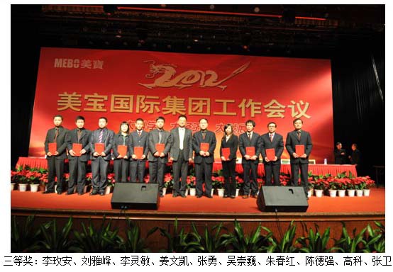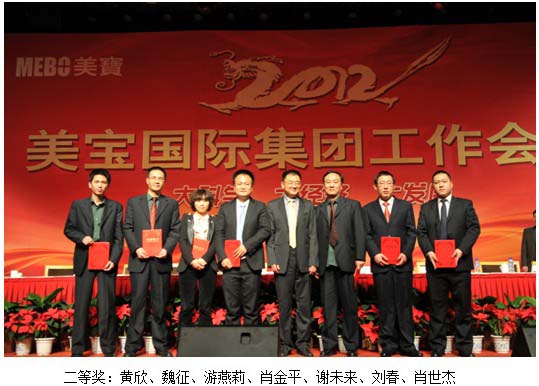 美寶燒傷創(chuàng)瘍集團(tuán)2011年度市場經(jīng)營業(yè)績表彰大會(huì)于2012年1月8日14:00在長安大飯店拉開帷幕。這次會(huì)議由燒傷創(chuàng)瘍集團(tuán)副總裁張坤主持,出席會(huì)議的有美寶國際集團(tuán)董事局主席徐榮祥、燒傷創(chuàng)瘍集團(tuán)總裁楊智斌及燒傷創(chuàng)瘍集團(tuán)全體人員,并由徐榮祥主席親自為所有獲獎(jiǎng)人員頒獎(jiǎng)。