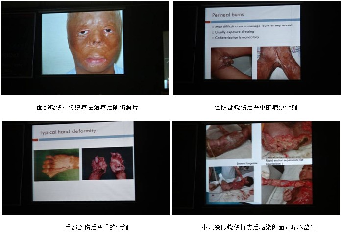 1月25日上午8點(diǎn)30分,會(huì)議正式開(kāi)幕。第一天,印度燒傷學(xué)會(huì)安排了全天的印度國(guó)內(nèi)繼續(xù)教育(CME)項(xiàng)目培訓(xùn),上午是口頭演講,下午是視頻手術(shù)演示,18位來(lái)自印度各大燒傷中心的主任或者學(xué)術(shù)帶頭人就燒傷中使用傳統(tǒng)外科技術(shù)方法在創(chuàng)面及系統(tǒng)治療中進(jìn)行了介紹。面對(duì)印度燒傷界專家在講臺(tái)上展示他們“成功”的案例時(shí),我們心中卻百感交集:本不富裕的印度人民和政府卻要為傳統(tǒng)外科技術(shù)治療燒傷過(guò)程中各種手術(shù)及手術(shù)后遺癥治療時(shí)高昂的費(fèi)用買單,同時(shí)燒傷病人還不得不承受創(chuàng)面恢復(fù)及身體康復(fù)過(guò)程中的痛苦;面對(duì)醫(yī)療資源的匱乏,甚至在燒傷止疼上,連最起碼地為病人減少疼痛的概念,還需要培訓(xùn)專家反復(fù)呼吁參會(huì)印度醫(yī)生引起注意;一張張面目全非的臉,一幅幅嚴(yán)重?cái)伩s瘢痕的照片,一幀幀血肉模糊的影像讓我們更加堅(jiān)信高性價(jià)比的再生醫(yī)療技術(shù)非常適合印度國(guó)情,再生醫(yī)療技術(shù)在印度全面地發(fā)展指日可待。