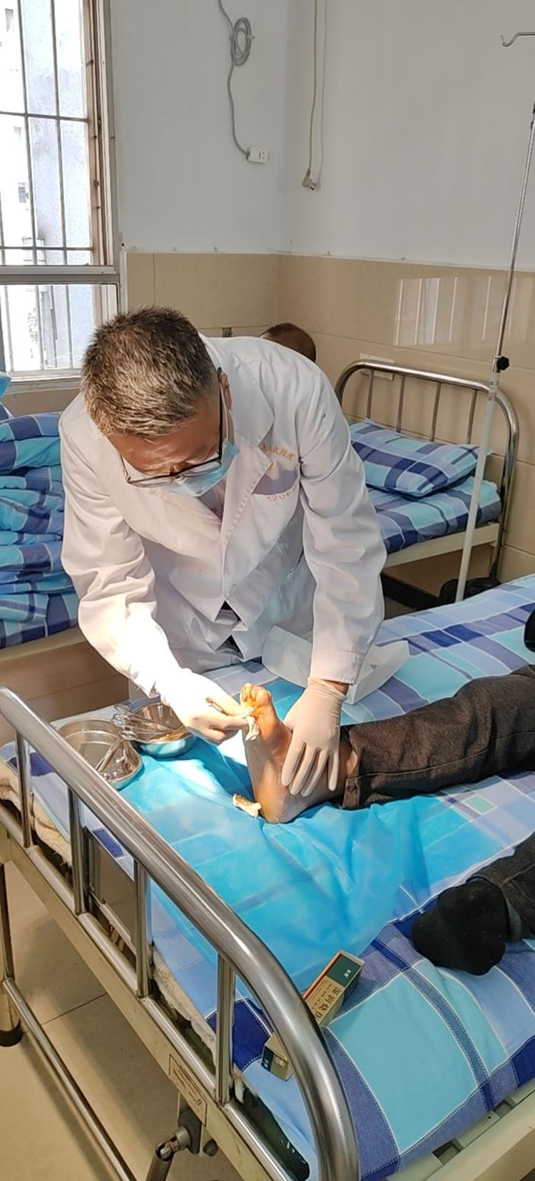 4月10日,北京榮祥再生醫(yī)學研究所副所長、中國中西醫(yī)結合學會燒傷專業(yè)委員會常務委員、《中國燒傷創(chuàng)瘍雜志》副總編輯、應用燒傷創(chuàng)瘍再生醫(yī)療技術治療糖尿病足領域專家王洪生主任,應廣東省四會市人民醫(yī)院骨科及燒傷科羅主任的邀請,到該院進行教學培訓及會診活動,該院上個月引進了再生醫(yī)療技術,在燒傷、壓瘡及糖足各種創(chuàng)面取得了良好的效果,為了進一步規(guī)范使用再生技術,王教授首先在示教室進行技術交流,隨后在病房示范換藥,指導該科醫(yī)護人員應用再生醫(yī)療技術在治療各種創(chuàng)面時注意的要點。王教授詳細的講解及示教受到該科醫(yī)護團隊的一致好評!