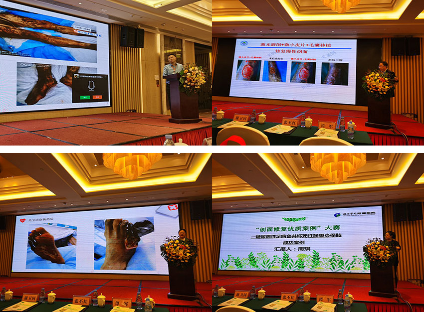 第二屆“榮祥杯”病例大賽一等獎(jiǎng)獲得人員分別作了參賽病例的匯報(bào),為各基層醫(yī)護(hù)人員規(guī)范使用再生醫(yī)療技術(shù)的努力和發(fā)展提供了方向和標(biāo)桿。婁底市第一人民醫(yī)院周勇以《再生醫(yī)療技術(shù)在特重度燙傷100%TBSA 患者中的應(yīng)用》為主題;瀏陽(yáng)市人民醫(yī)院焦獻(xiàn)功以《美寶濕潤(rùn)燒傷膏治療特大面積燒傷創(chuàng)面》為核心;湖南省人民醫(yī)院姚夢(mèng)枝以《為糖尿病患者保駕護(hù)航--多學(xué)科診療合作(MDT)》為方向;湘南學(xué)院附屬醫(yī)院周琪以《一糖尿病性足病合并壞死性筋膜炎保肢成功案例》、中南大學(xué)湘雅三醫(yī)院胡蛟以《一例壓力性損傷合并截癱患者的創(chuàng)面修復(fù)案例 》做了現(xiàn)場(chǎng)病例展示。