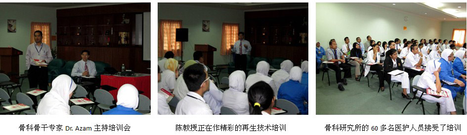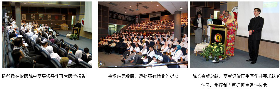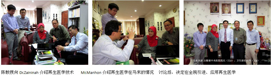 一年后(2011年4月),當醫(yī)院院長Dato & Dr. Zaininah獲知陳教授再次來到吉隆坡時,馬上約陳教授到辦公室做客。聽完陳教授對再生醫(yī)學的介紹后,院長非常激動,堅定馬上組織起全院的各科主任和護士長,請陳教授進行再生醫(yī)學報告和進行培訓,同時還組織召開了專題會議,商討全面引進再生醫(yī)學技術和展開臨床研究、申請將MEBO盡快進入到國家基本用藥范圍的計劃等。